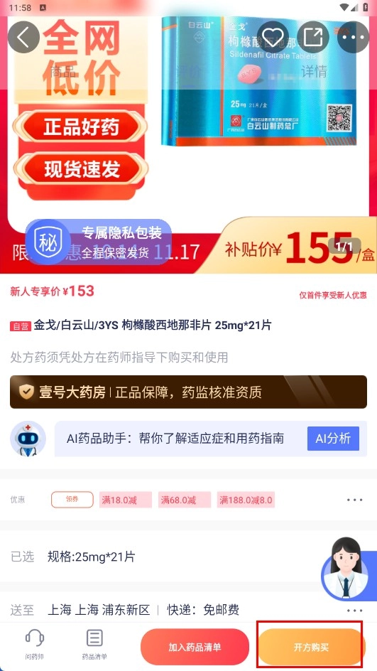 最后点击【开方购买】功能按钮,再按照流程完成药品购买操作。