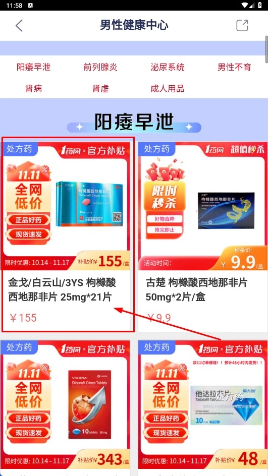 在男性健康中心,可挑选【阳痿早泄-分类标签】类目下的药品,例如金戈枸橼酸西地那非片。