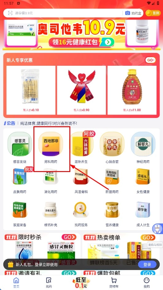 点击【男科用药-分类标签】,即可进入男性健康中心页面。