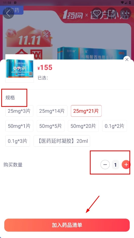 在选定药品规格并确定购买数量后,点击【加入药品清单】这个功能按钮。
