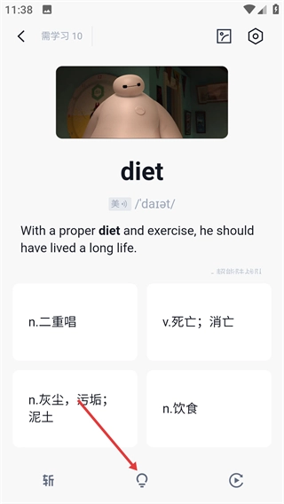 在单词学习页面点击底部的释义提示按钮,查看单词释义及例句翻译。