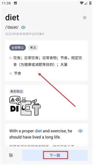 点击【下一题】按钮,就能继续学习下一个单词,从而完成单词学习的流程。