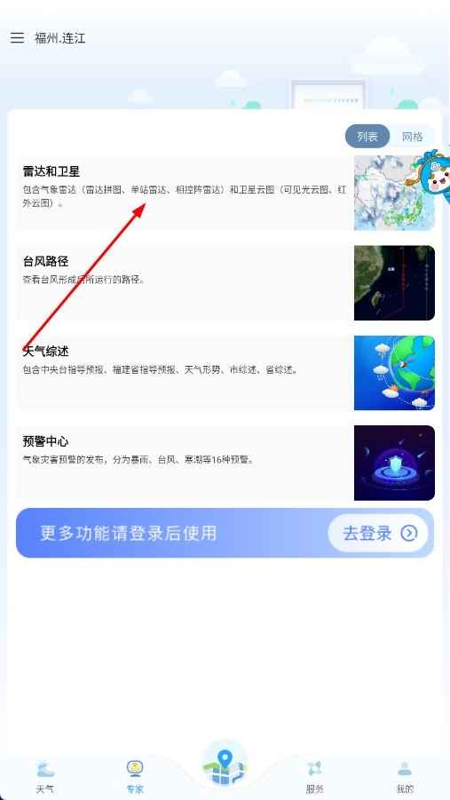 点击【专家】功能按钮,进入专家页面后,选择【雷达和卫星】功能模块。