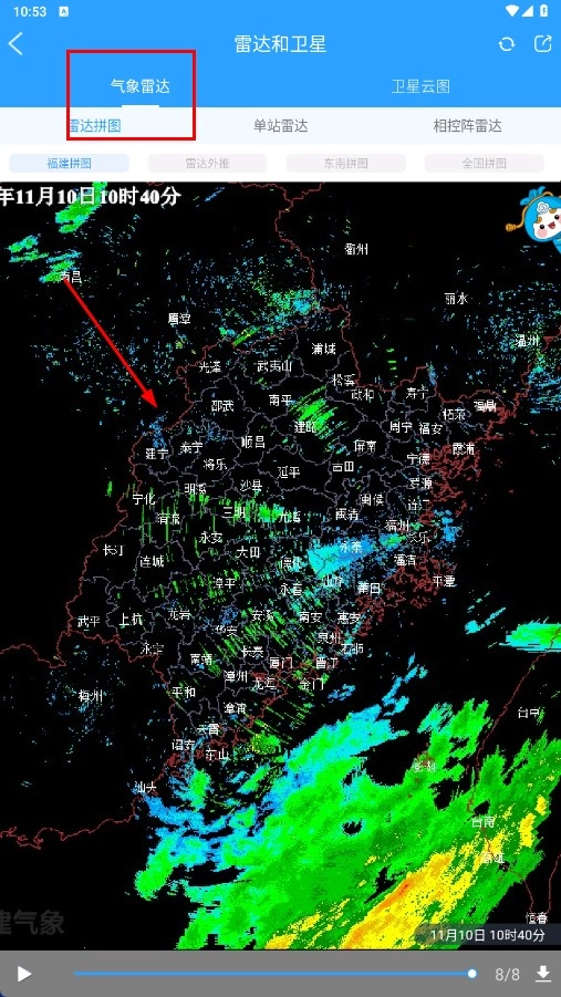 进入雷达与卫星页面后,点击【气象雷达-功能选项】,就能查看雷达拼图,从而知晓气象雷达所监测到的天气情况。