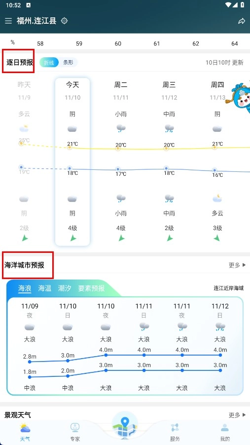 点击【逐日预报】功能模块,能够查看多日天气的变化趋势;点击【海洋城市预报】功能模块,则可以查看与海洋相关的天气信息。