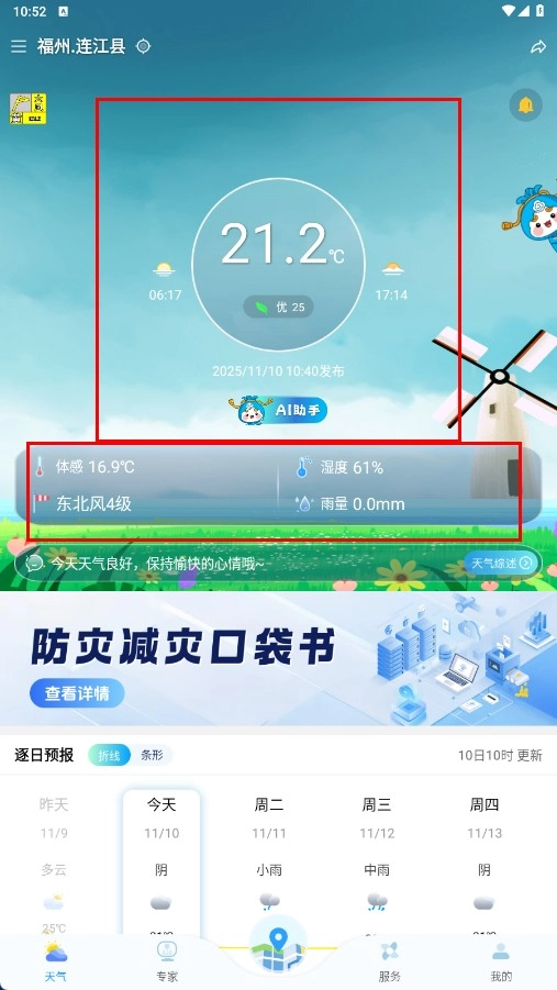 在天气主页面,能够查看当前气温、体感温度、湿度等天气相关信息。