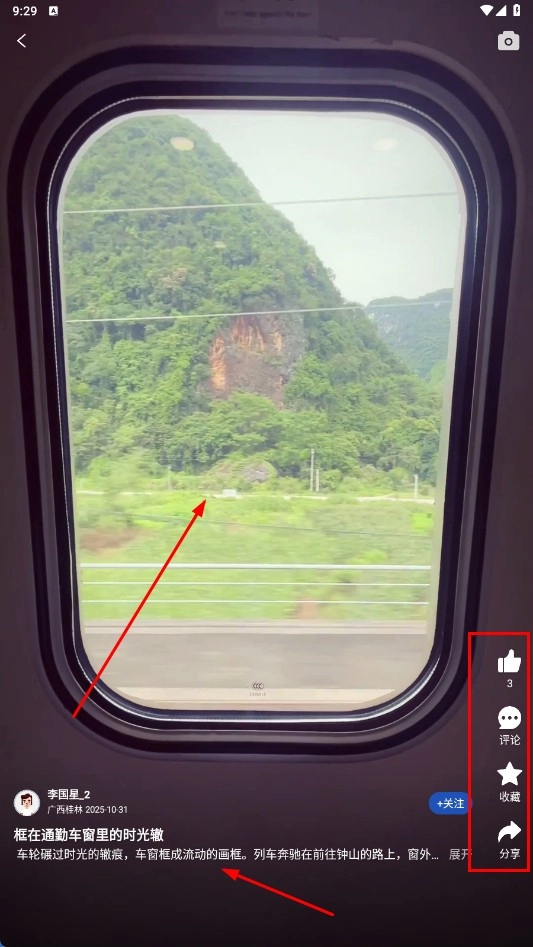 查看【框在通勤车窗里的时光辙】的帖子详情,既能欣赏窗外的风景,也可以进行点赞、评论、收藏或者分享操作。