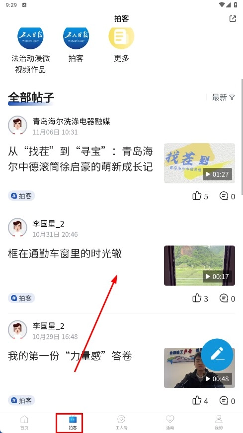进入【拍客】板块,浏览【全部帖子】,查看【青岛海尔洗涤电器融媒】等用户发布的帖子。