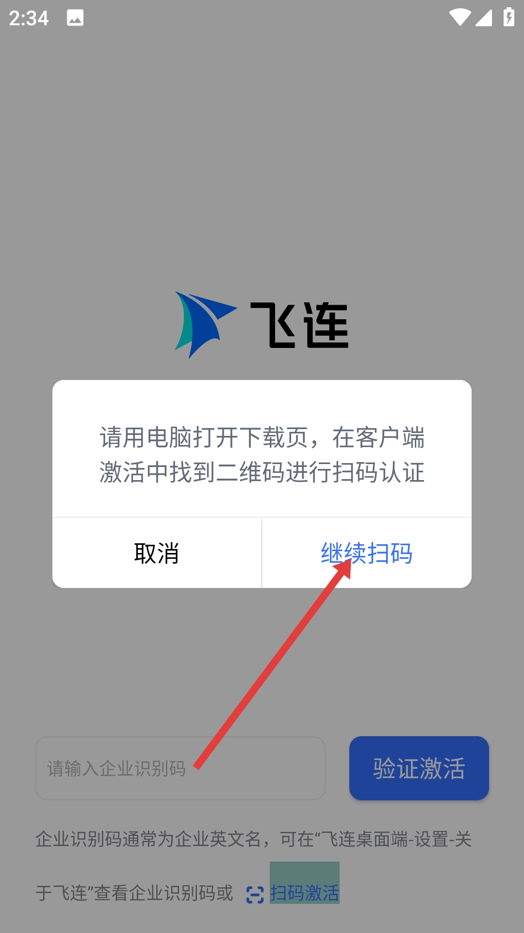 当扫码认证的提示框弹出时,点击【继续扫码】按钮,即可进入扫码界面。