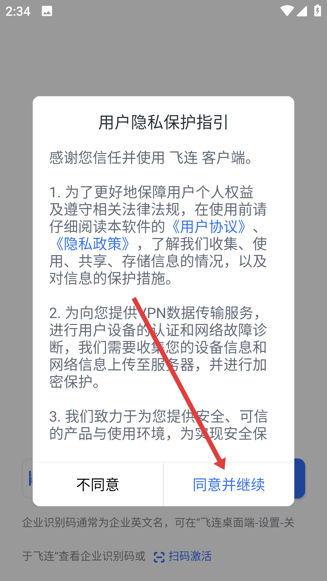 在使用飞连客户端之前,请先阅读【用户隐私保护指引】,并在了解【用户协议】与【隐私政策】的内容后,点击【同意并继续】按钮。