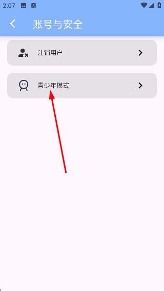 在账号与安全页面找到并点击【青少年模式】选项,即可进入青少年模式的设置界面。
