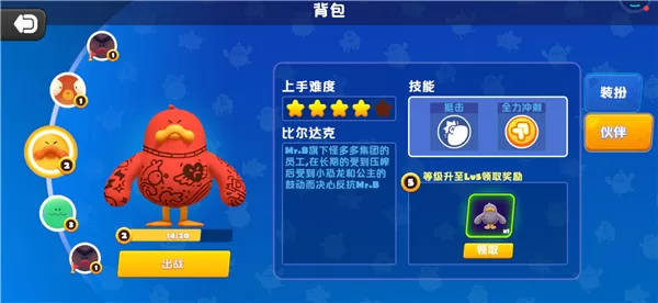 这是签到送的角色,原型是可达鸭。跳起来会发出鸭子的叫声。技能是挺击(普通攻击)、全力冲刺。全力冲刺会跑的更快一点,需要长按。如果单点就是挺击。跑的比其它角色快,不过目前会偶尔卡到bug,就是单点也是全力冲刺,那样就不能挺击(普通攻击)了。