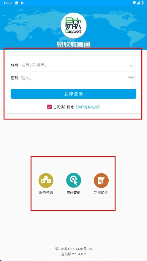 进入登录页面后,你可以在账号和密码输入框中填写相关信息,此外还能使用【服务咨询】【密码查询】【功能简介-功能入口】这些选项。