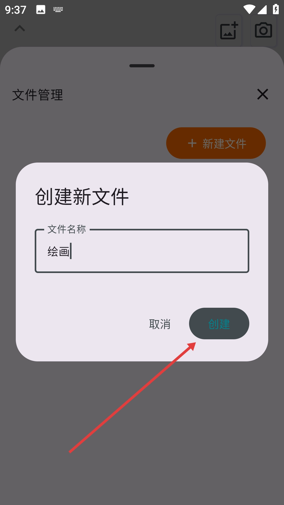 在新建文件的窗口里输入文件名称,比如【绘画】,然后点击【创建】按钮。