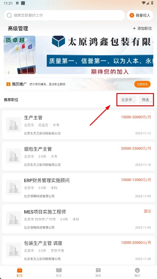 在职位页面,点击【筛选】功能按钮,就能筛选职位信息。