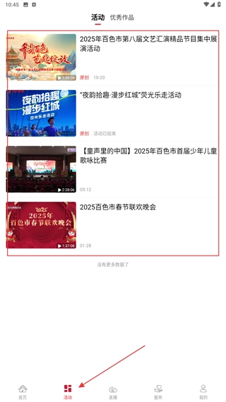 点击页面底部的【活动】功能按钮,进入活动页面后,即可浏览包括文艺汇演、歌咏比赛在内的各类文艺及节庆活动信息。