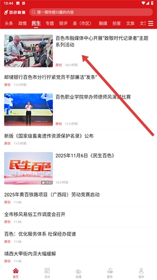 在列表页面挑选你感兴趣的新闻条目,比如【百色市融媒体中心开展“致敬时代记录者”主题系列活动-新闻标题】这一条,然后点击该条目就能进入新闻详情页面。