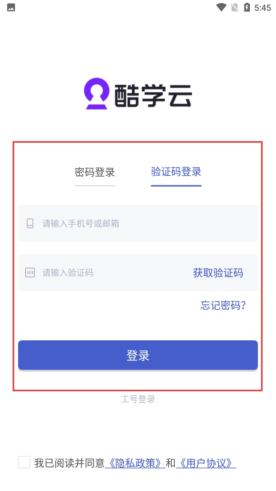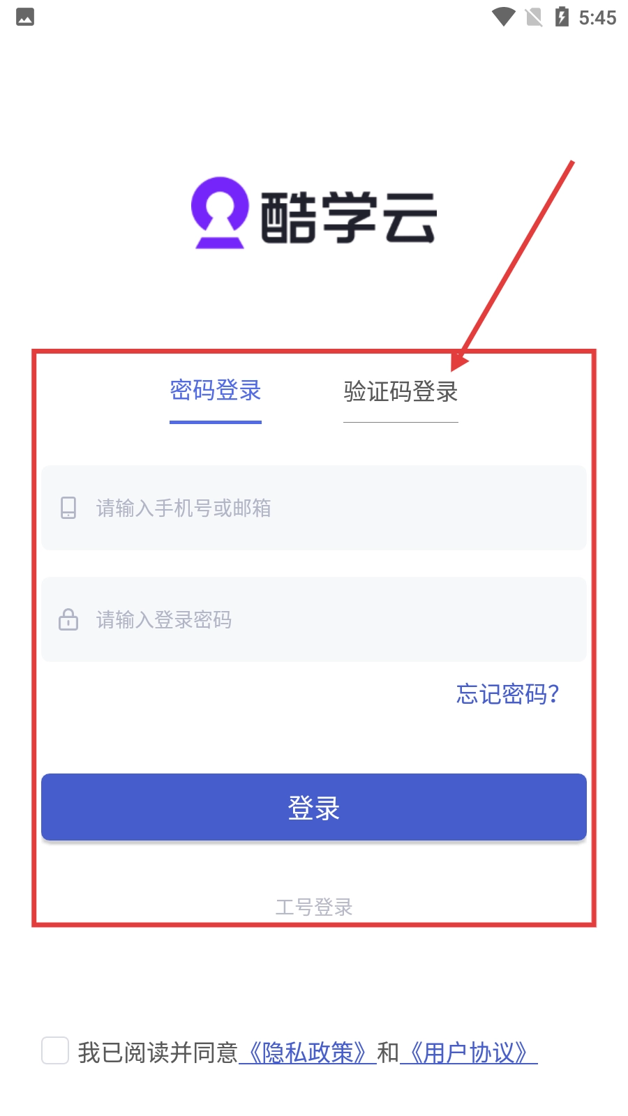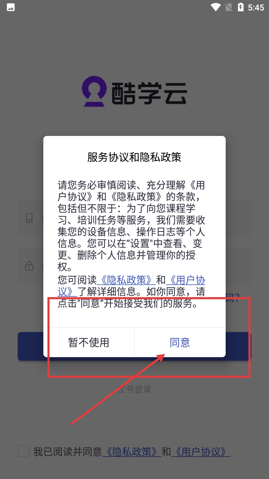 进入酷学云后,在弹出的【服务协议和隐私政策】窗口中点击【同意】按钮,即可进入登录方式选择页面。
