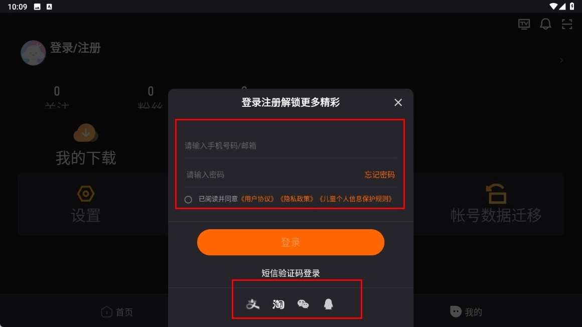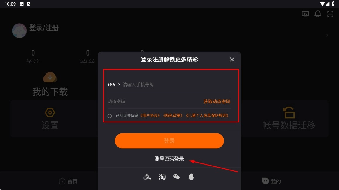 在账号密码登录页面,用户既可以输入账号和密码登录,也能选择支付宝、淘宝、微信、QQ等第三方平台完成登录操作。