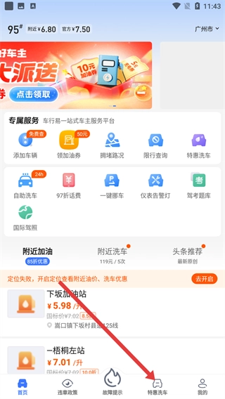 在软件首页找到【特惠洗车】的功能入口并点击,就能进入洗车服务的相关页面,进而开启洗车优惠的查询与购买流程。