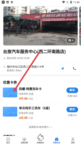 在门店详情页面中,找到“优惠卡券”板块,点击选择“田螺·特惠洗车卡”,即可查看该卡券的具体价格和对应的服务详情。