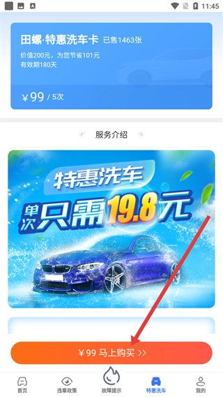 进入洗车卡详情页面后,点击【¥99立即购买>>】按钮,就能完成特惠洗车卡的购买,进而享受优惠洗车服务。