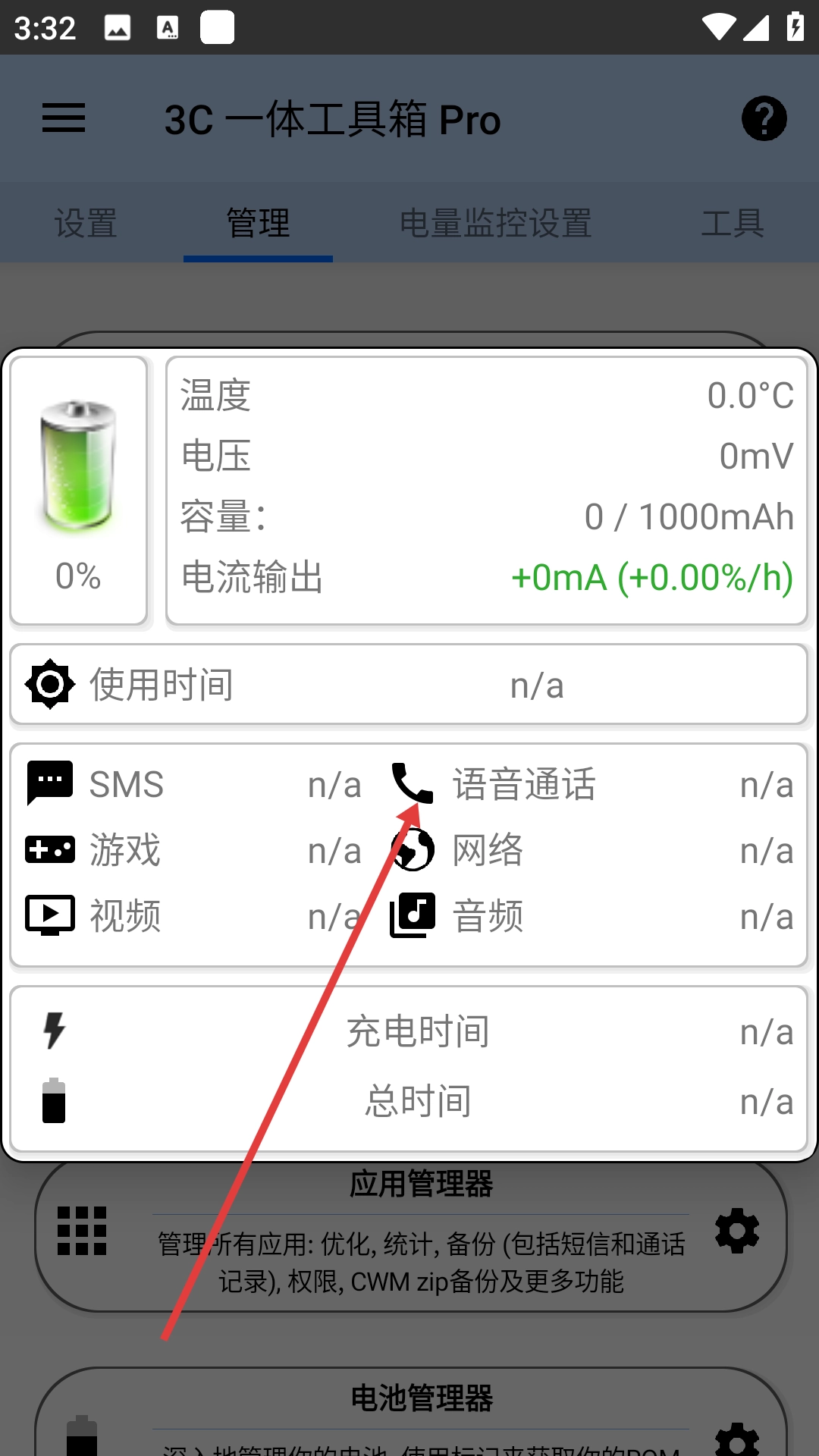点击该按钮后会弹出电池信息的弹窗,在这个弹窗里能够查看电池的温度、电压、容量等详细信息。