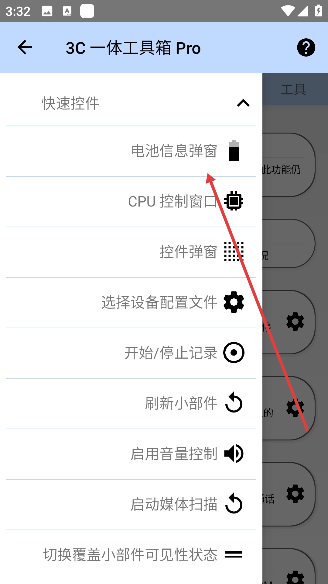 在功能列表里点击【快速控件】,就能展开它下面的电池信息弹窗、CPU控制窗口之类的功能选项。
