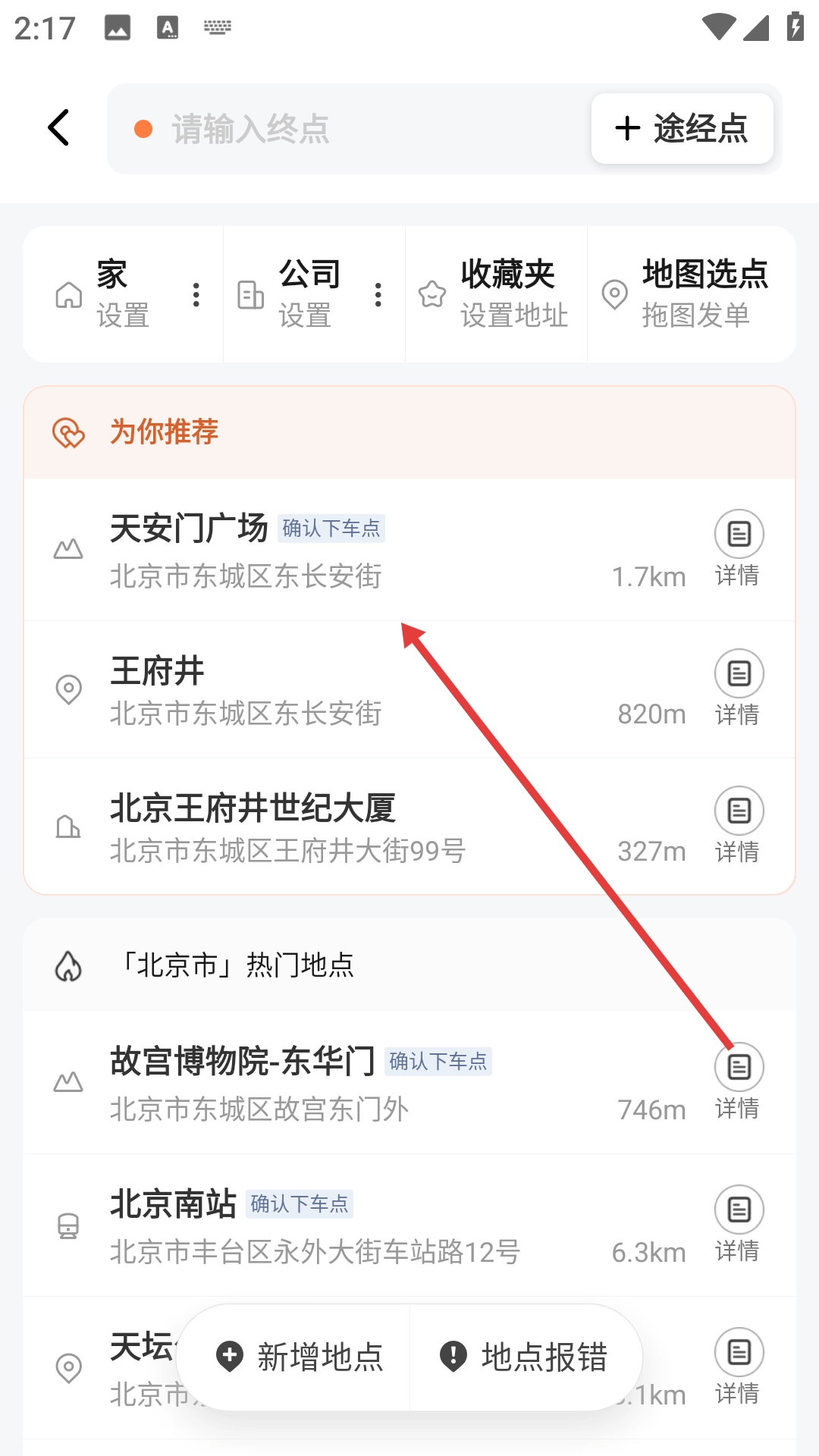 在目的地选择页面选择目标地点(如天安门广场)。