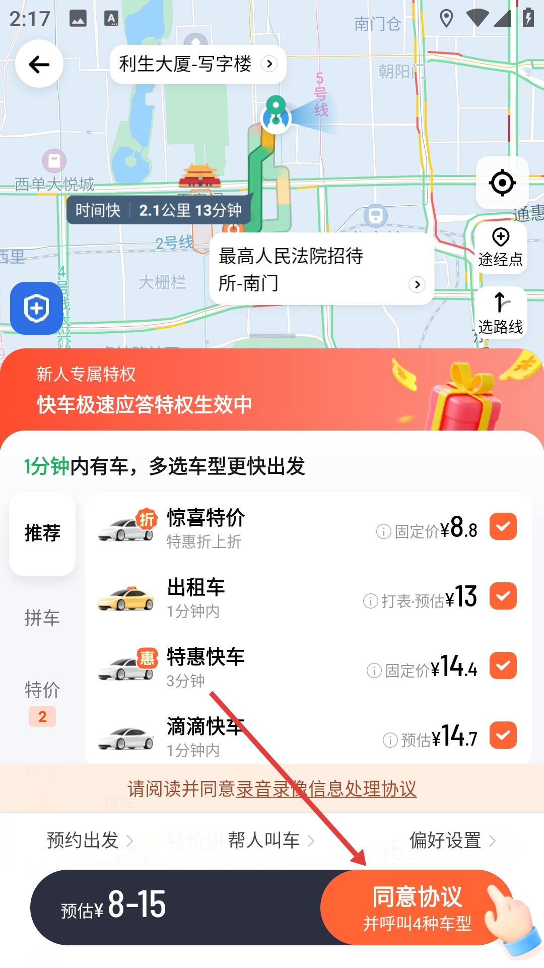 在叫车界面点击【同意协议并呼叫4种车型】按钮,即可完成叫车操作。