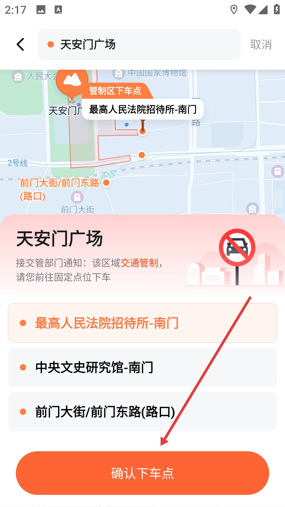 在管制区下车点页面点击【确认下车点】按钮,即可进入叫车页面。