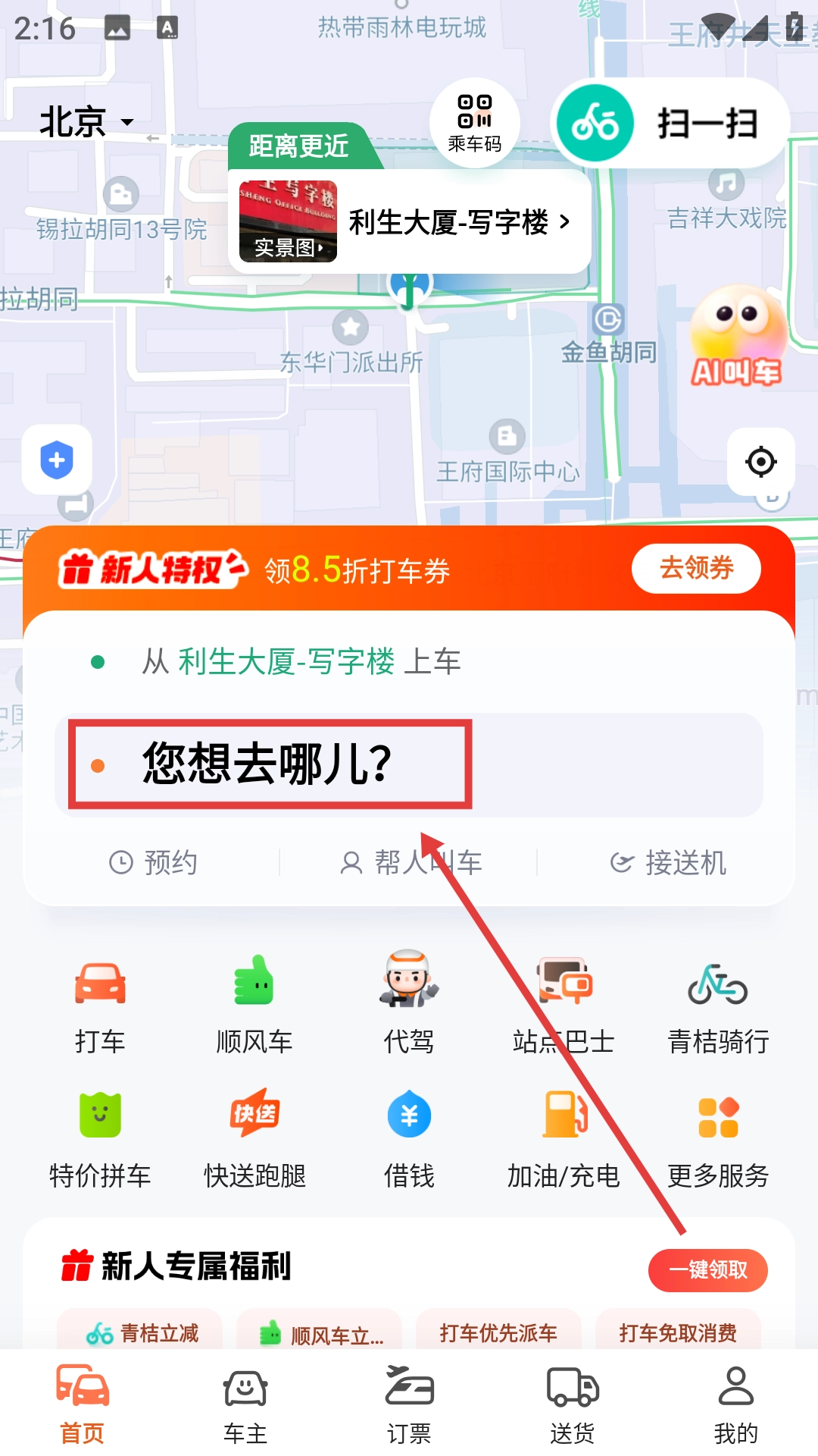 点击【您想去哪儿?】这个输入框,就能进入目的地选择页面。