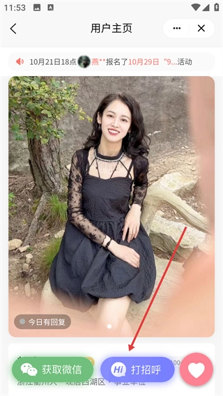 在用户主页点击【打招呼】,可与该用户进行互动。