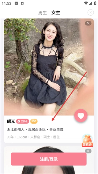 在相亲板块挑选目标用户(例如“韶光”),然后进入该用户的主页。