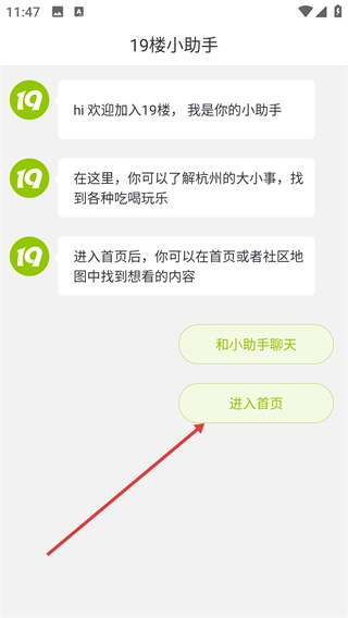 在“19楼小助手”页面点击【进入首页】按钮,即可进入19楼的首页。