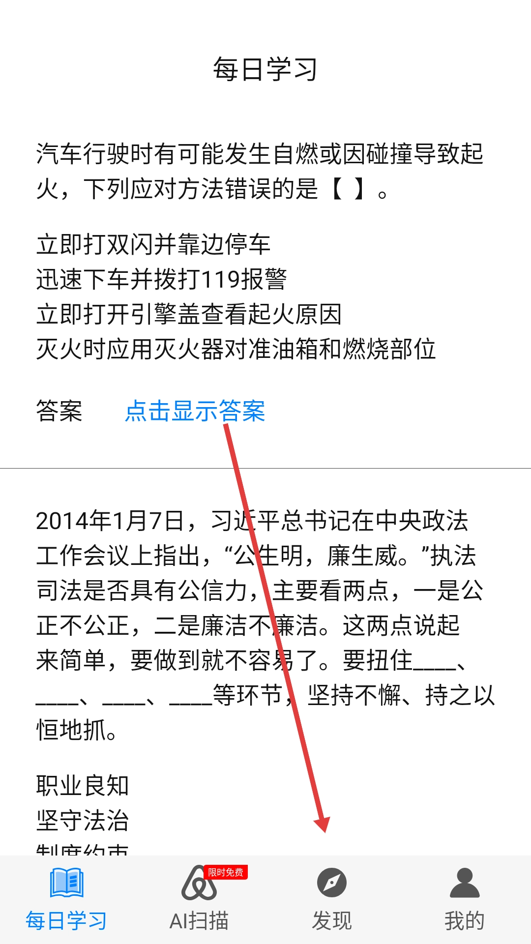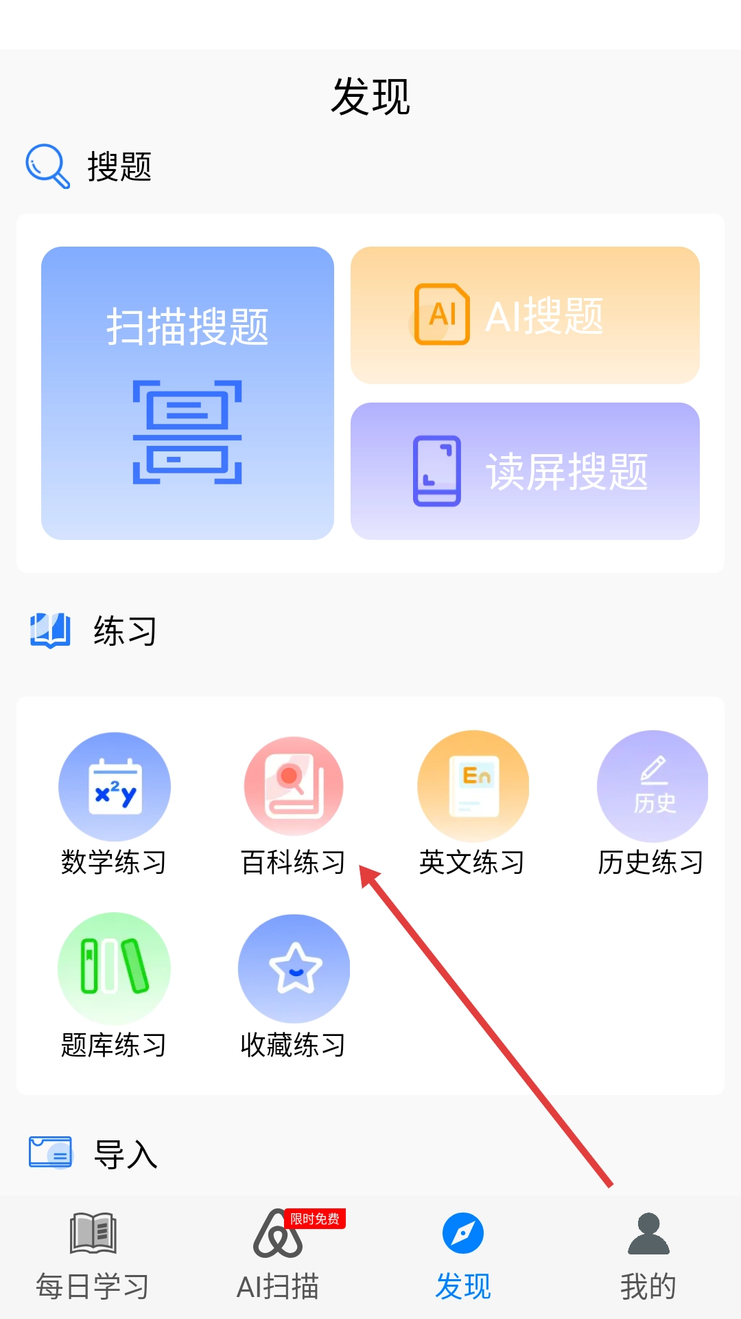 在发现页面的练习板块中点击【百科练习】,即可进入百科练习题的答题界面。
