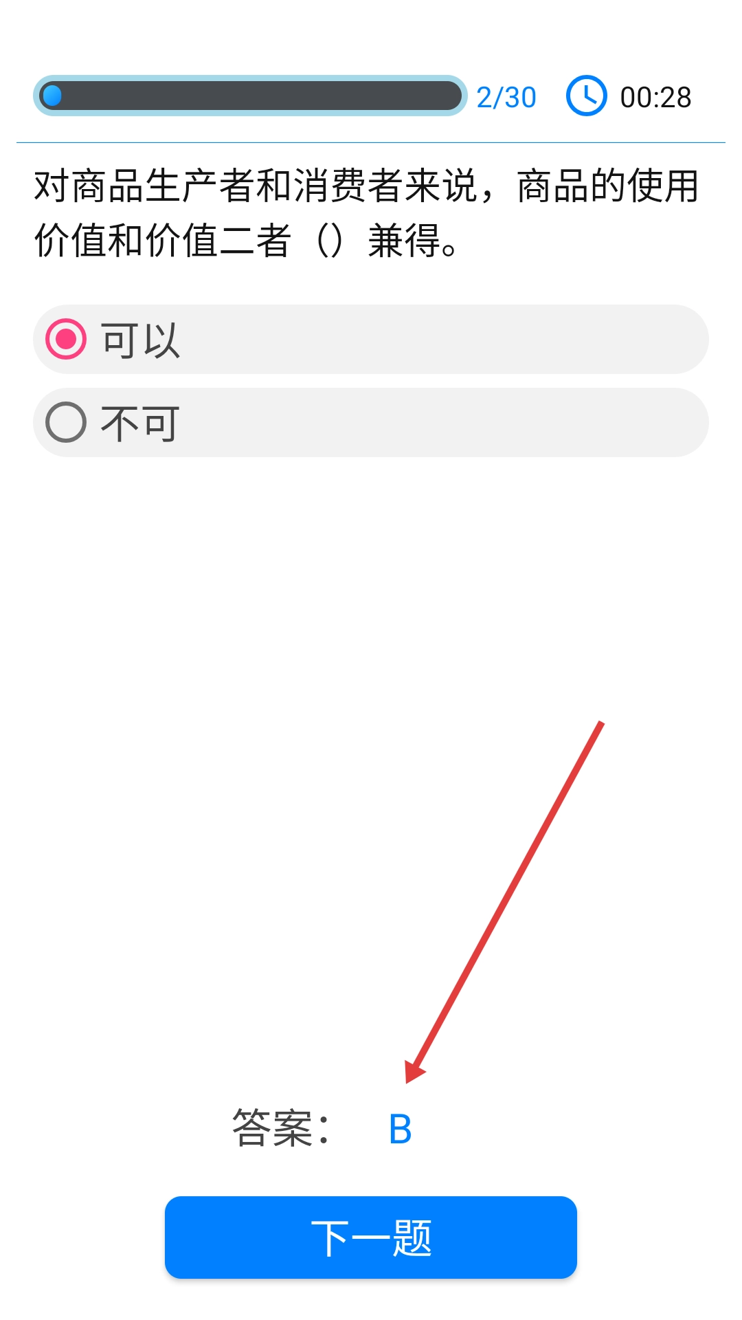选择答案后,若查看答案显示为【B】,请点击【下一题】按钮,继续完成百科练习的下一道题目。