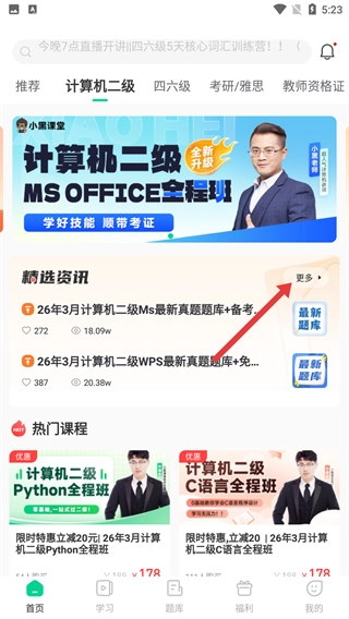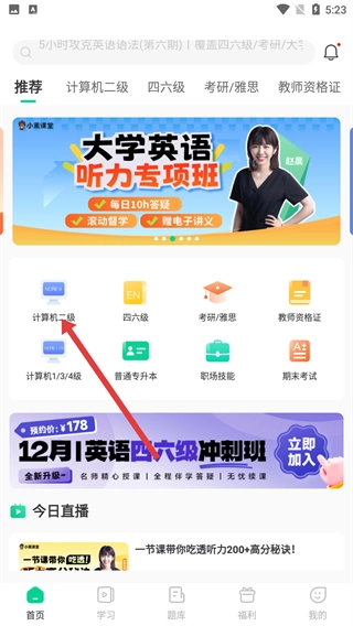 在学习类首页,找到并点击【计算机二级】分类入口,即可进入计算机二级的相关页面。