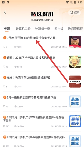 在精选资讯列表里,找到并点击标题为【9月24日开始|四六级80天抢分备考方案!】的资讯内容,即可进入该资讯的详情页面。