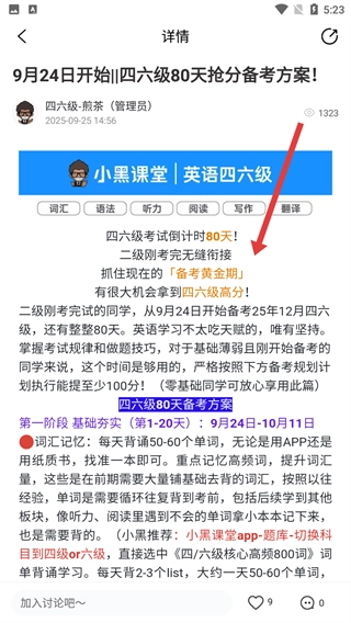 在资讯详情页面,能够查看【四六级80天抢分备考方案】的具体内容,其中涵盖了备考阶段、词汇记忆等相关信息。