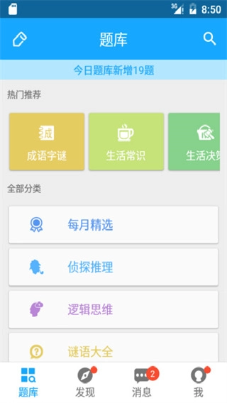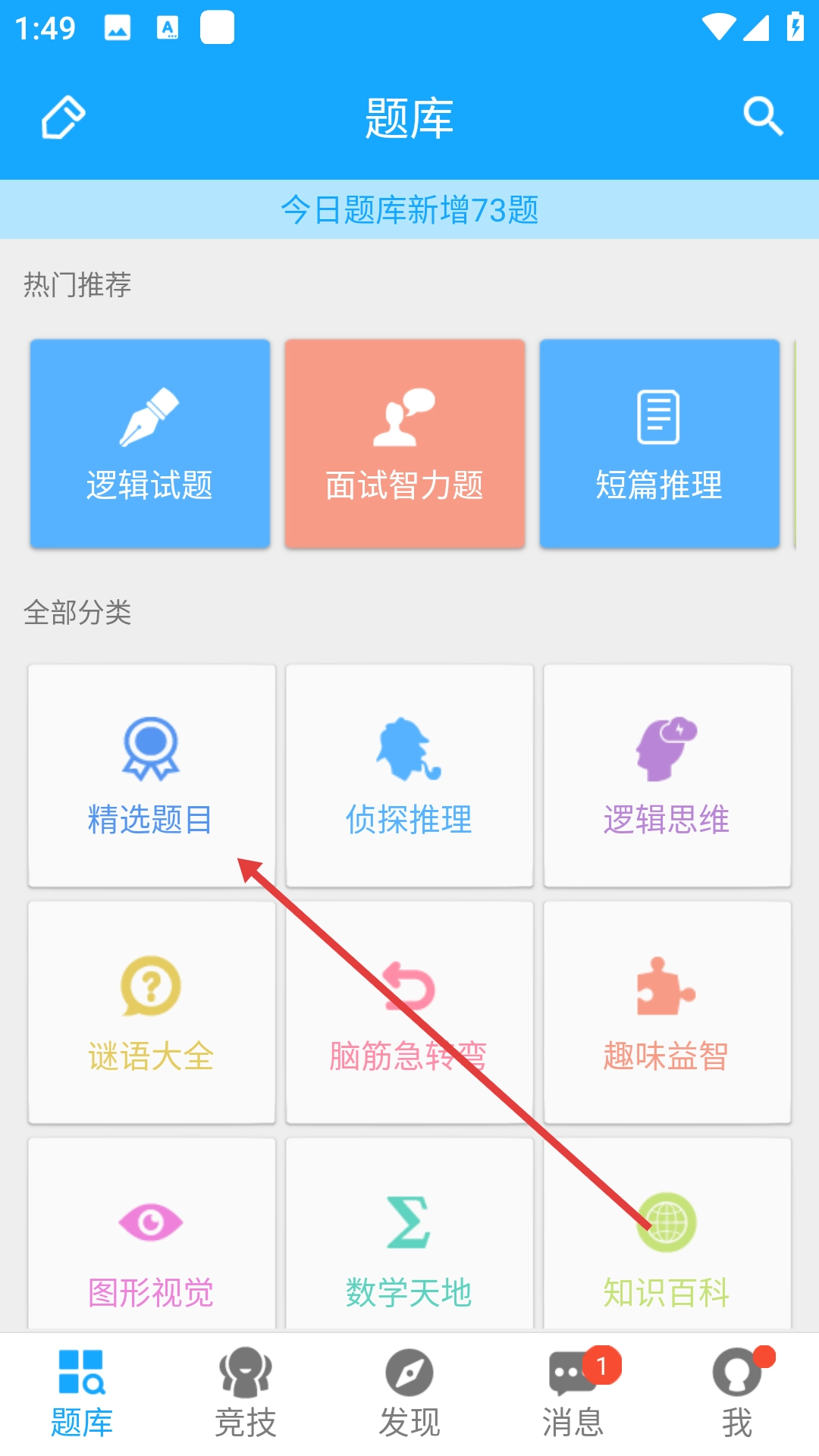 点击【精选题目】选项,就能进入对应的精选题目页面,在该页面中可以浏览到逻辑、推理等不同类型的题目。