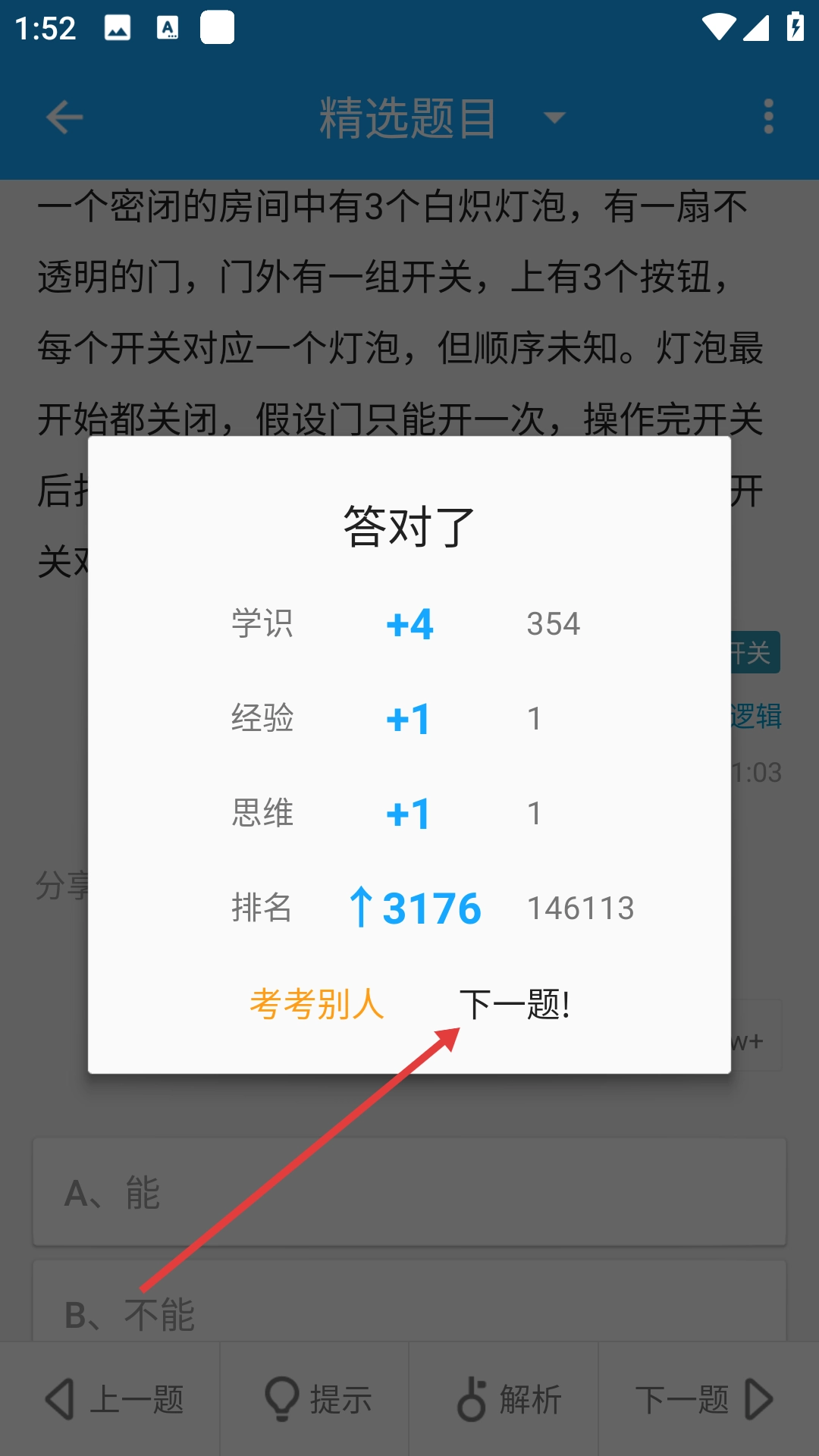在答对题目之后,点击【下一题】按钮,就可以继续练习其他的逻辑推理类题目了。