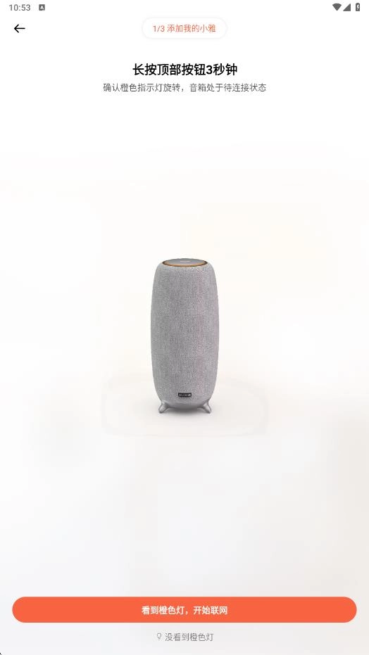 长按小雅Nano的「暂停」按键3秒,等橙色指示灯闪烁起来后,点击【橙色灯开始闪烁】按钮就能完成配对校验了。