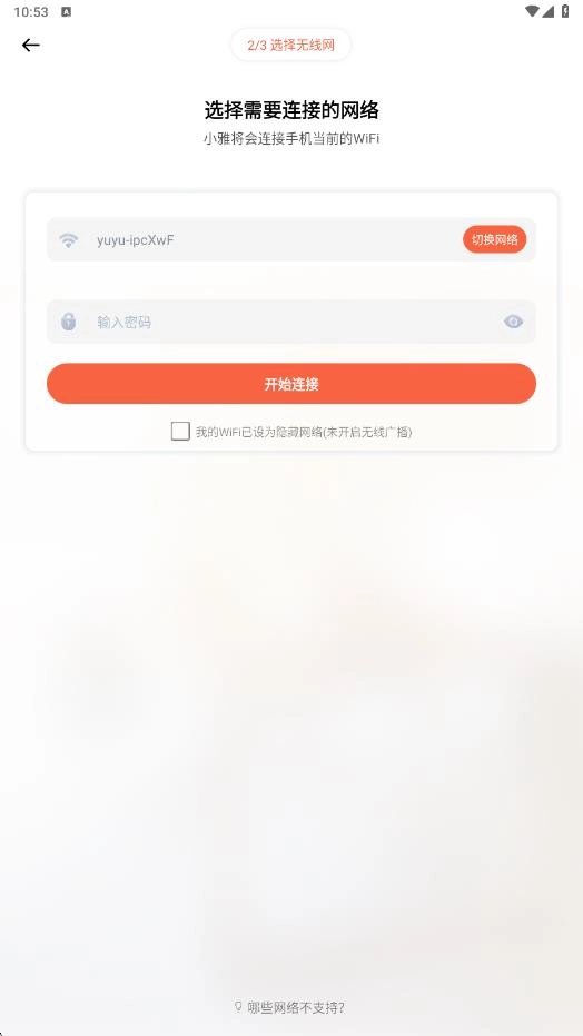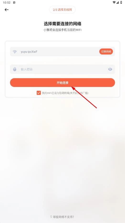 在网络选择界面核实WiFi名称,输入密码后勾选【我的WiFi已设为隐藏网络(未开启无线广播)】这一选项,最后点击【开始连接】按钮,即可完成网络配置流程。