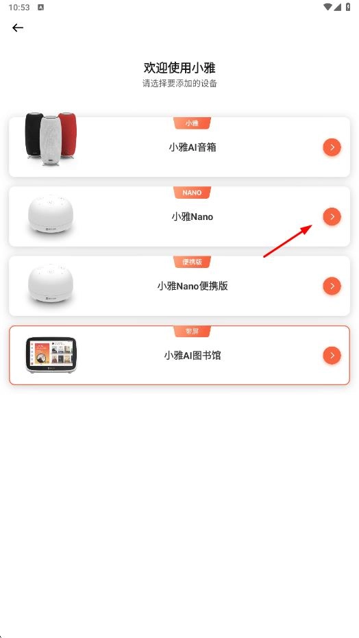 进入小雅设备添加界面,点击【小雅Nano】右侧的箭头,即可启动该设备的连接流程。