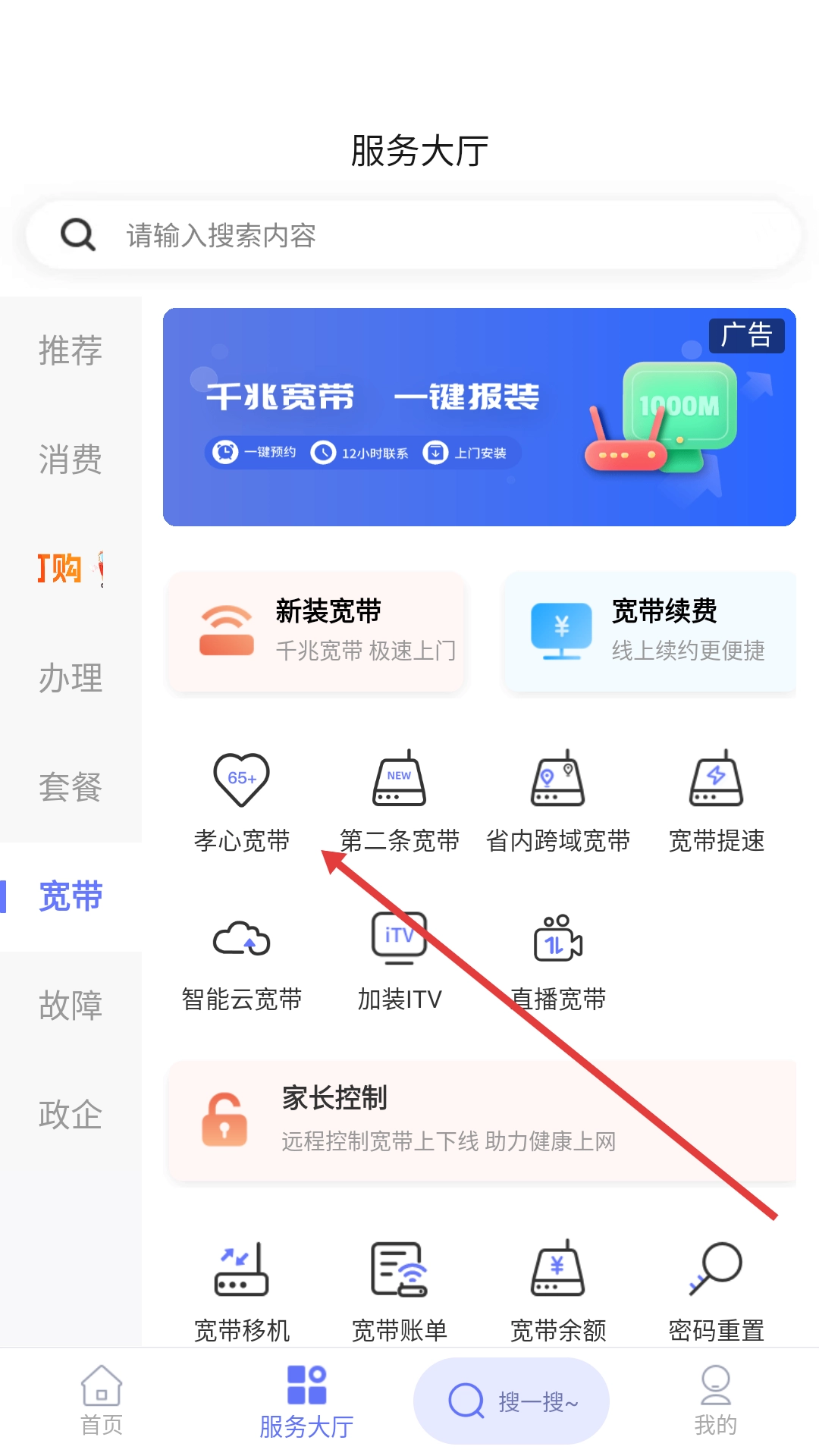 在服务大厅里找到【孝心宽带】这个选项并点击它,就能进入到孝心宽带的办理页面了。
