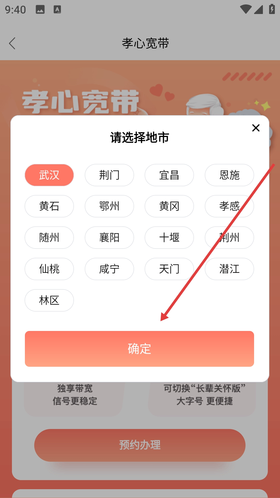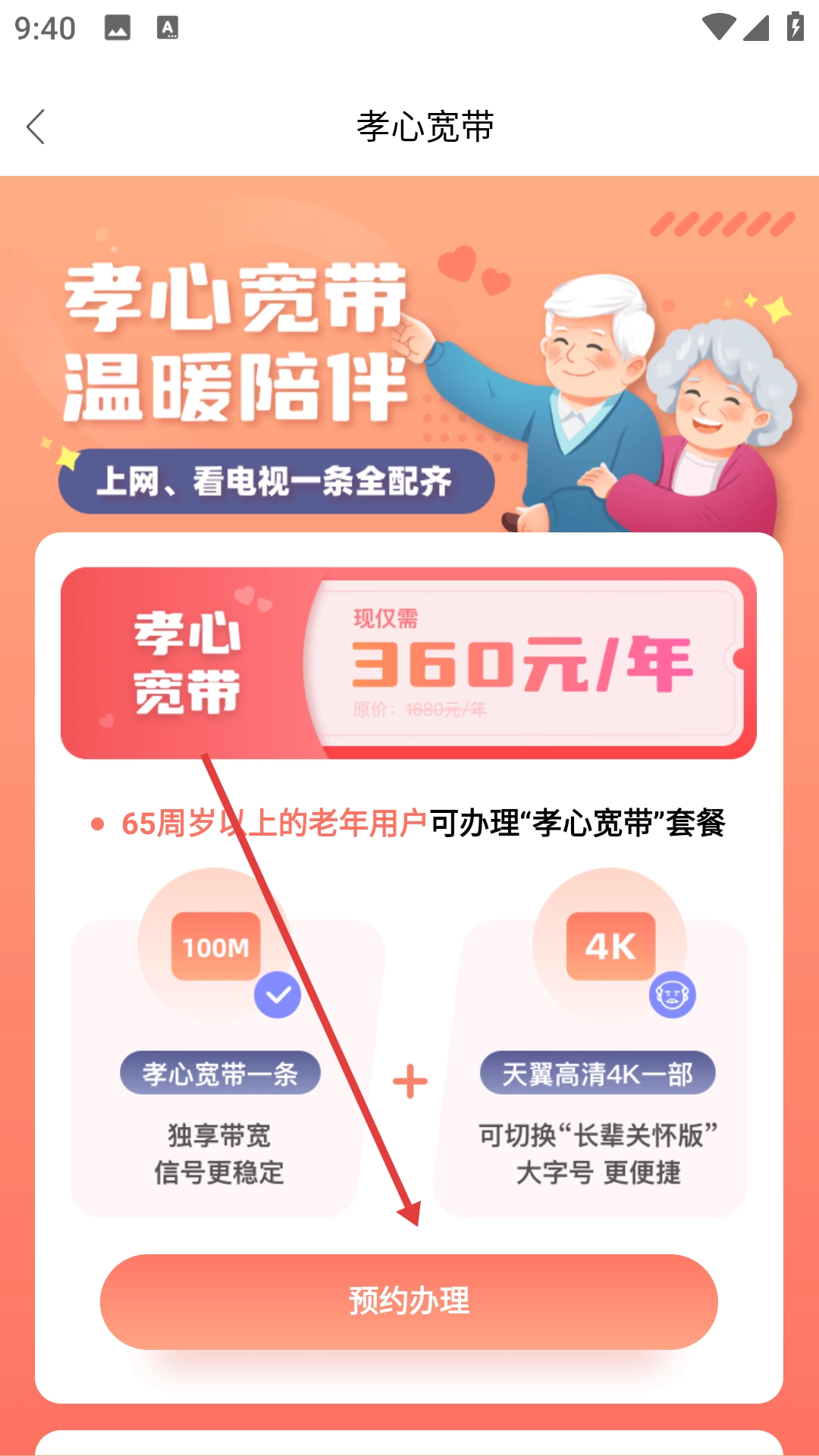 点击【预约办理】,即可申请办理孝心宽带套餐。