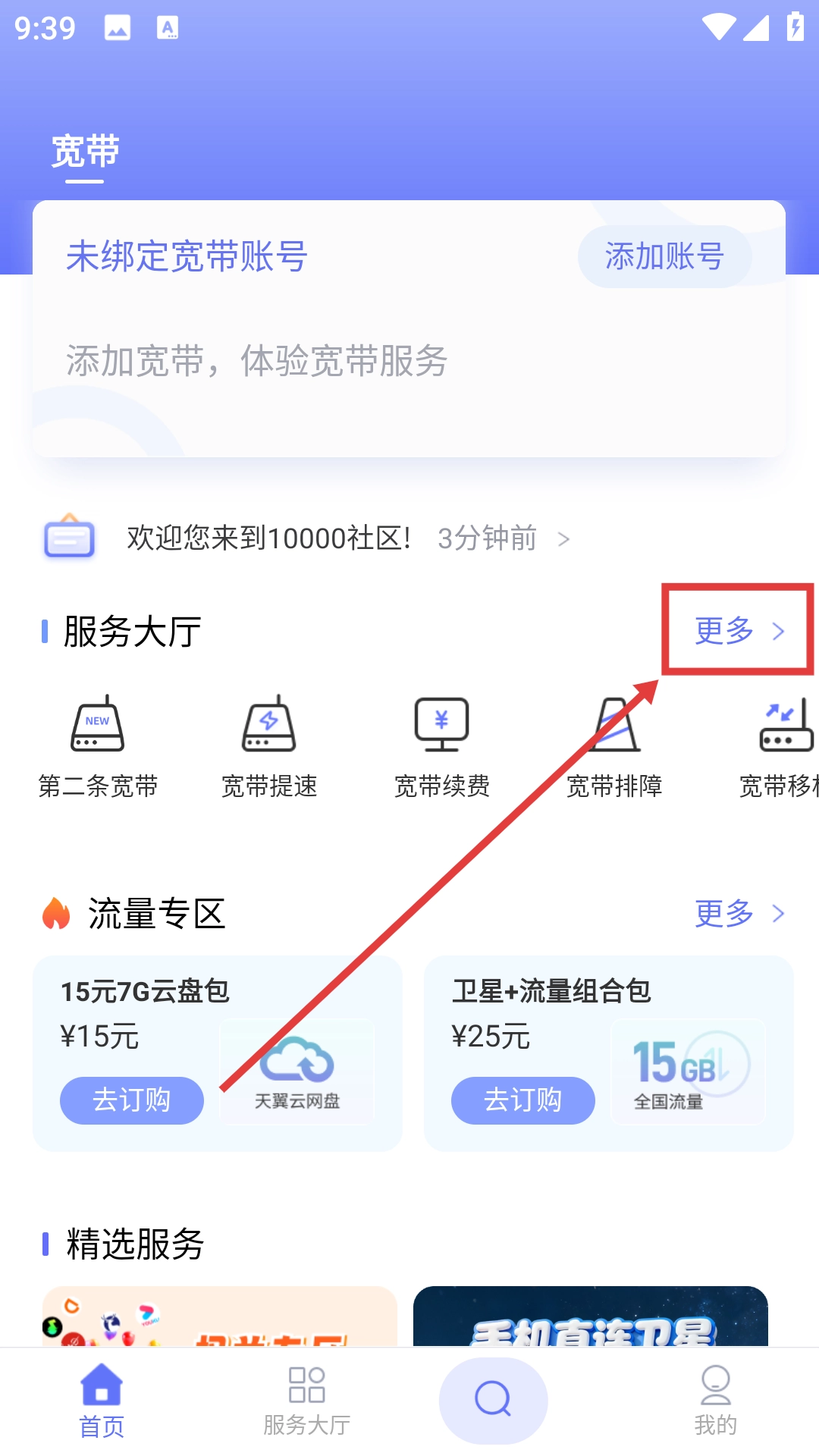 在首页的“服务大厅”板块中点击【更多】按钮,即可进入服务大厅的具体页面。