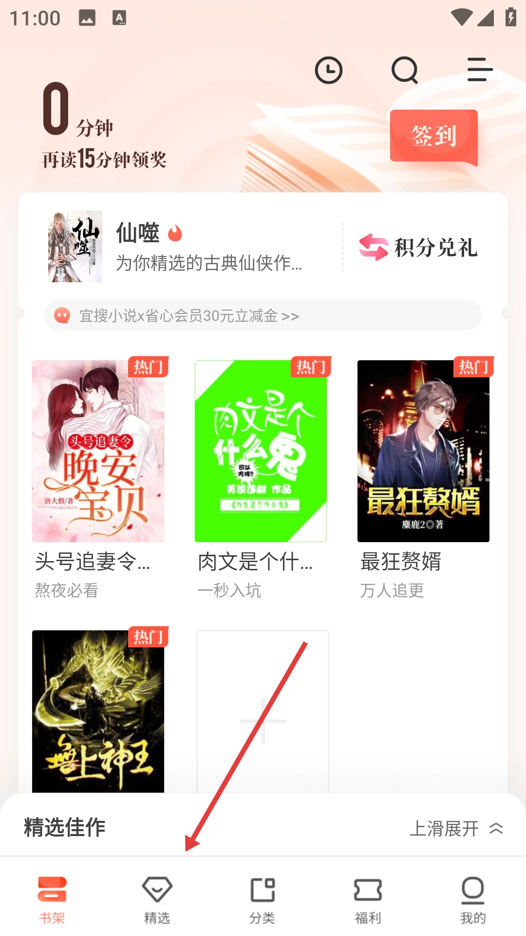 点击底部的【精选】按钮,就能进入精选页面,在那里可以查看推荐、人气热书榜等各类书籍分类。