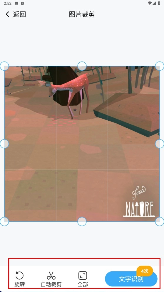 进入图片裁剪界面后,能够执行旋转和裁剪操作,之后点击【文字识别】功能按钮即可识别图片中的文字内容。